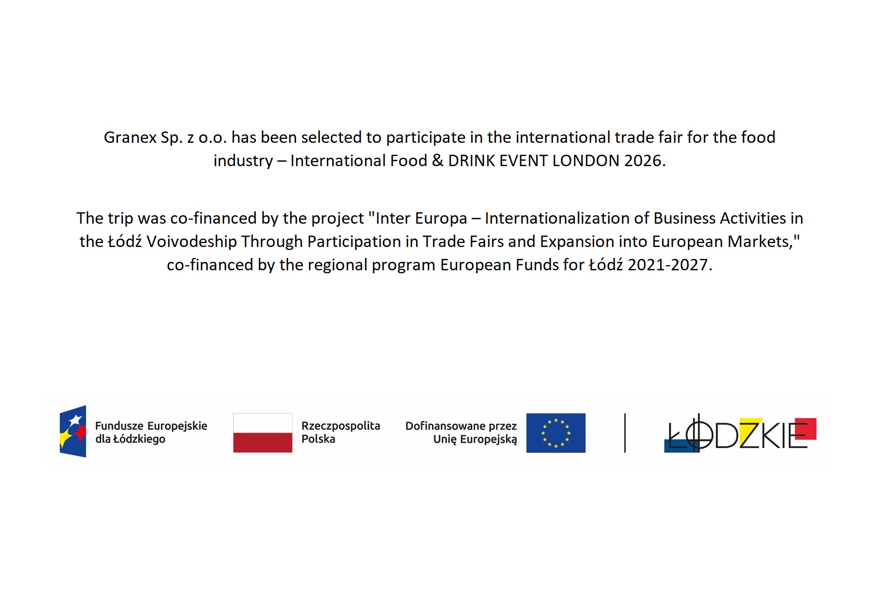 Granex implements the project entitled “Developing a strategy for conquering foreign markets as an instrument of company development” within the framework of the Regional Operational Programme for the Łódzkie Province for the years 2014 – 2020, Priority axis II: Innovative and competitive economy, Measure: II.2: Internationalisation of enterprises, Sub-measure: II.2.1: Business models of SMEs.